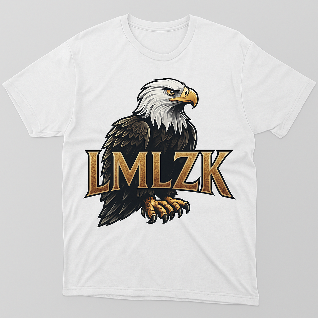 Affiche ta force et ton charisme avec ce t-shirt blanc orné d’un majestueux aigle royal. L’impression haute définition met en valeur chaque détail : plumes sombres, tête fière et serres puissantes. Juste en dessous, le texte “LMLZK” est écrit en grandes lettres dorées, donnant un style imposant et élégant.